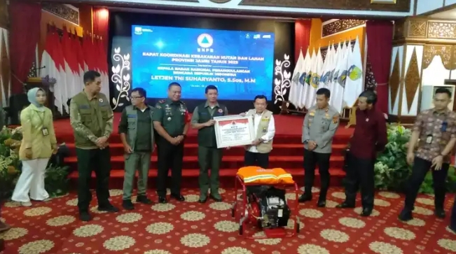 Pada kesempatan ini, Kepala BNPB juga menyerahkan bantuan alat berupa mesin pompa, nozzle, selang, flexible tank dengan kapasitas 5.000 L serta perlengkapan APD guna mendukung operasi melalui jalur darat.