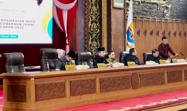 “Maka pada kesempatan ini, kita menggelar rapat paripurna dengan agenda penyampaian Nota Pengantar Laporan Pertanggungjawaban Gubernur Jambi Tahun Anggaran 2023. Untuk itu penyampaian tersebut disampaikan oleh Gubernur Jambi,”ujarnya.