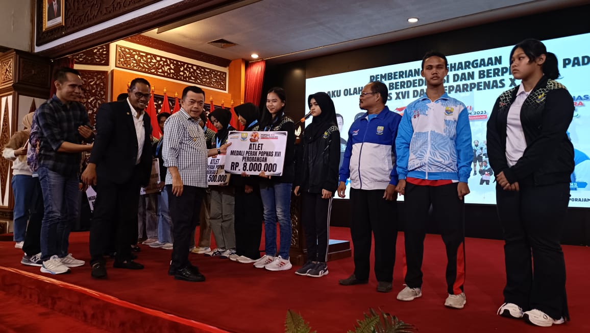 serunting.id, Jambi – Gubernur Jambi Al Haris menyerahkan bonus kepada pelaku olahraga berdedikasi dan berprestasi pada Pekan Olahraga Pelajar Nasional (Popnas) XVI dan Pekan Paralimpik Pelajar Nasional (Peparpenas) X yang berlangsung di Sumatera Selatan 2023 lalu.