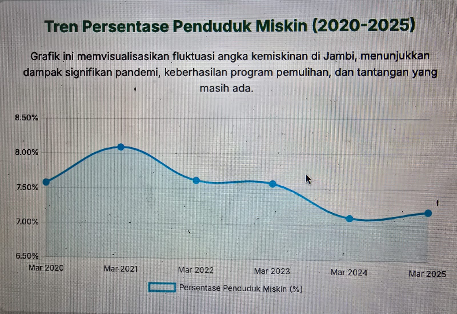 Dengan tagline “data Angka kemiskinan Provinsi Jambi Maret 2020-2025” maka disebutkan kenaikan jumlah dan persentase penduduk miskin pada periode September 2020 dan Maret 2021 disebabkan oleh adanya pandemi Covid-19.