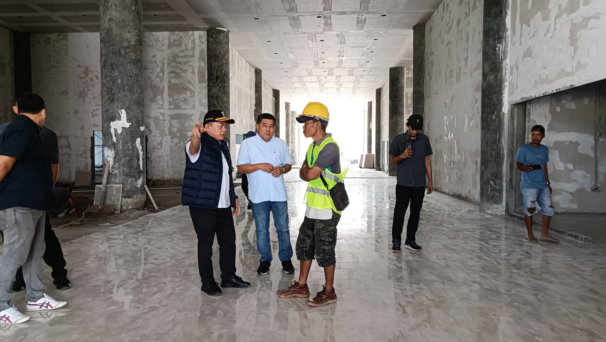 Gubernur Al Haris melakukan pemantauan ke seluruh sisi mega proyek yang saat ini dalam tahap pemasangan kerangka atap dan pemasangan keramik tersebut.